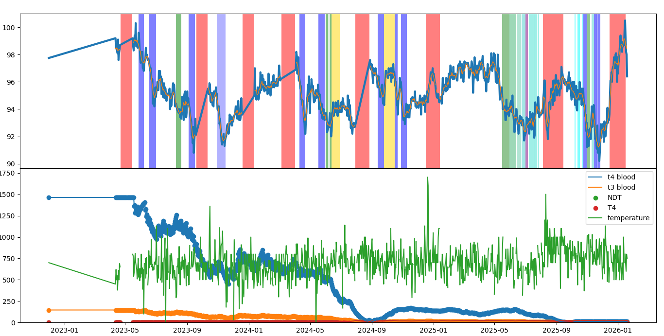 I expect to need to reduce my thyroid dose. At the moment I’m torn between ‘I’m too hot’ and ‘I feel really tired’, but I don’t have any other low-thyroid symptoms, in particular no sign of plantar fasciitis, which is usually one of the first symptoms of ‘too low’, so I think the feeling awful must have some other cause. I’m going to leave it where it is for a bit but I expect to be back soon to feeling fine except for being too hot, at which point I’ll start to reduce it again.